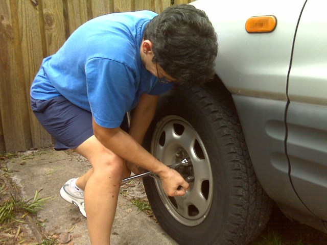 30 minutes and one big hernia later we had loosened the lug nuts. The few extra pounds I’ve gained helped enormously on that last stubborn nut. I placed my foot on the lug tool, gently bounced up and down and slowly the nut turned.