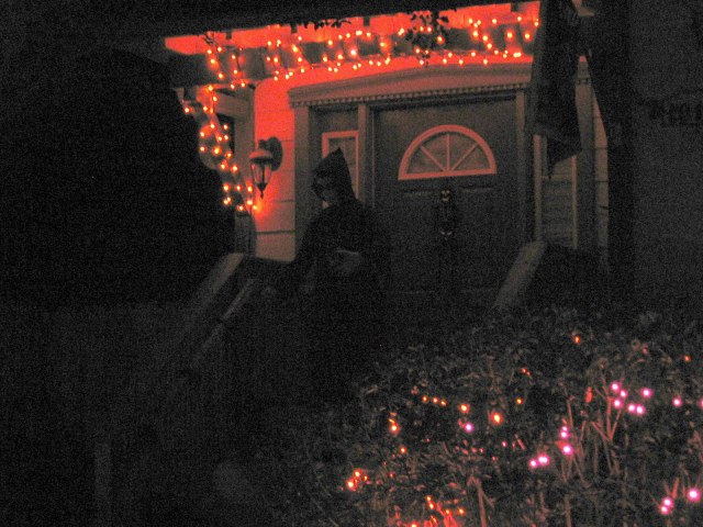 We have audio playing as “trick or treaters” come into the yard. Unfortunately, the video had to be cut off before the witch cackles – more kids were coming and we had to quickly take up of our positions for the next fright!