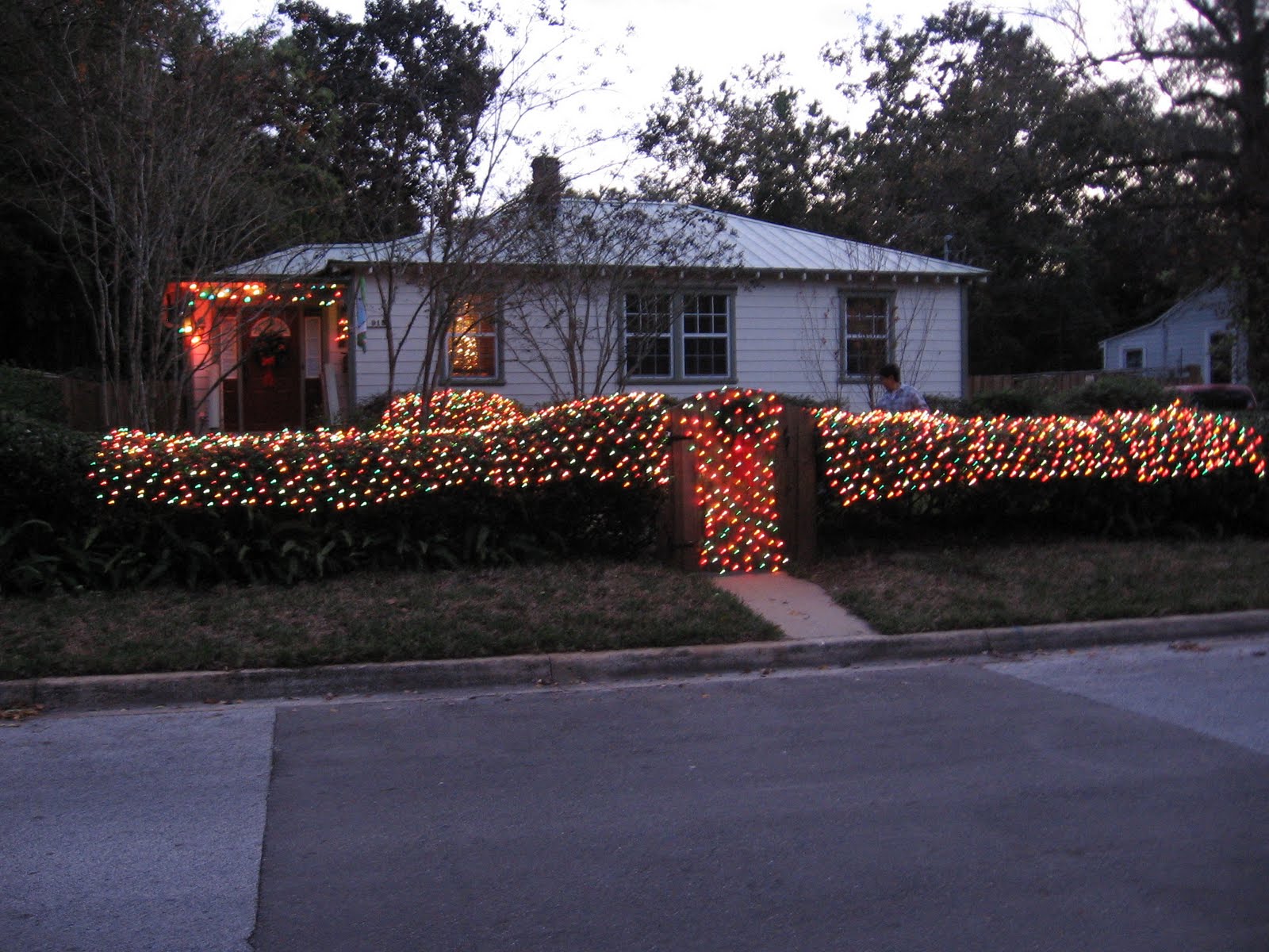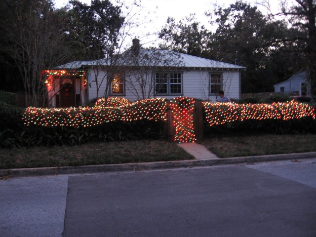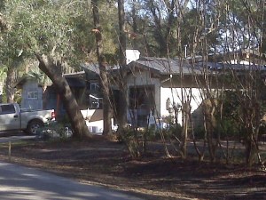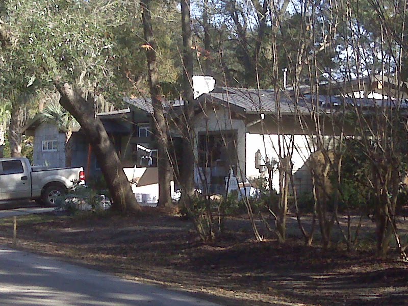 Okay, okay… the picture isn’t great – the sun was in the wrong position – will need to go back during an afternoon and get a better picture. Interestingly, the house next door had 2x4s holding some plastic in place on the roof, ostensibly to prevent leakage. I think there should be a show called “Extreme Repair” where 10-20 houses get much needed repairs. Just a thought.