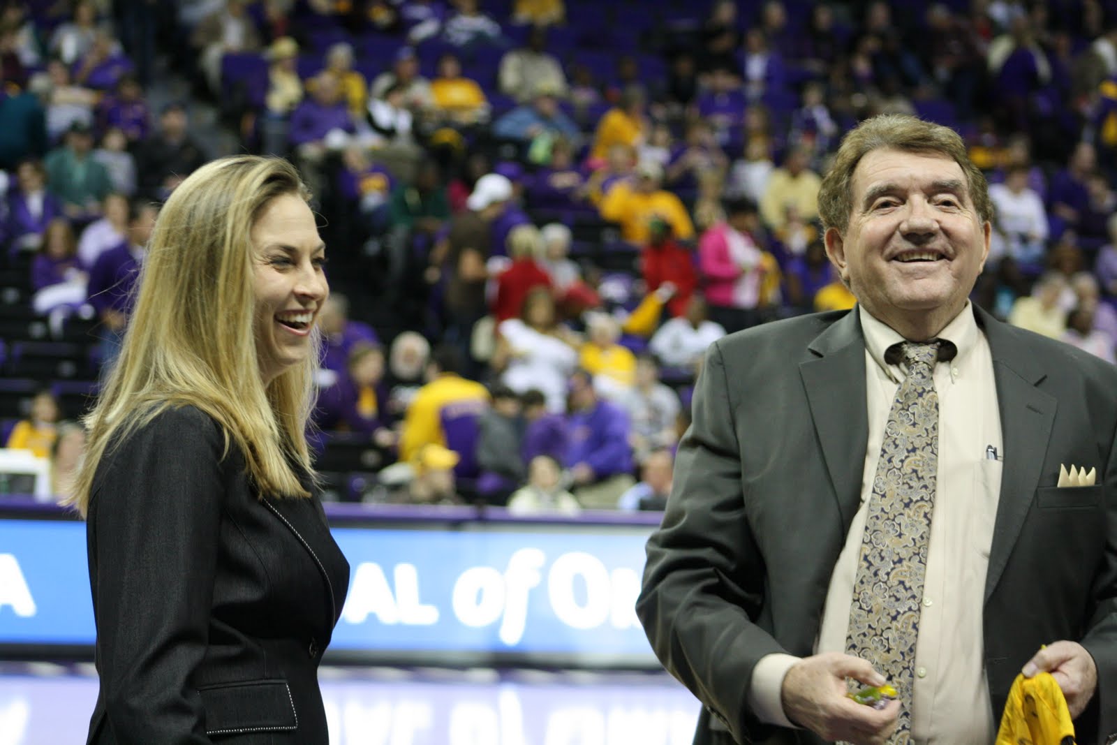 We had the wonderful opportunity to travel to Baton Rouge, La and watch the Florida Women’s Basketball team play the LSU tigers. We lost the game, but the trip was still great! Here’s a good pic of Coach Butler and Coach Van Chancellor. Before each home game, Coach Chancellor tosses pieces of candy to the crowd. It was fun. Can’t wait for the next road trip!