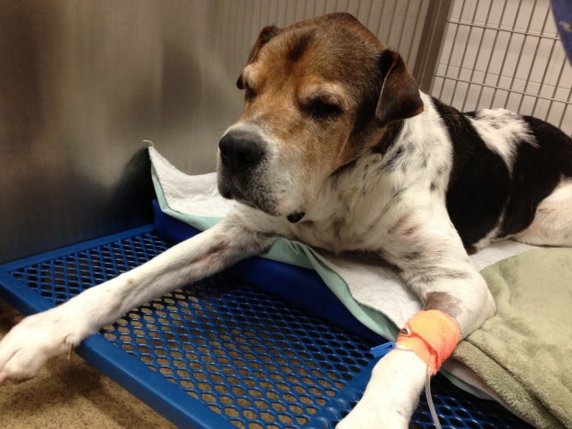 Here is Boxer today – yes, he’s been admitted to the hospital. Current diagnosis is nephritis – he’s on continuous fluids and antibiotics to fight infection and rehydrate. He’ll spend his second night there as he tries to recover. We visited him yesterday and today and he looked so much better. He was also more alert and active. We took him outside for a short walk and pee/poop session. Eating is an issue – we’re thinking about hiring a personal canine chef to cook for him. I’m only half-kidding.