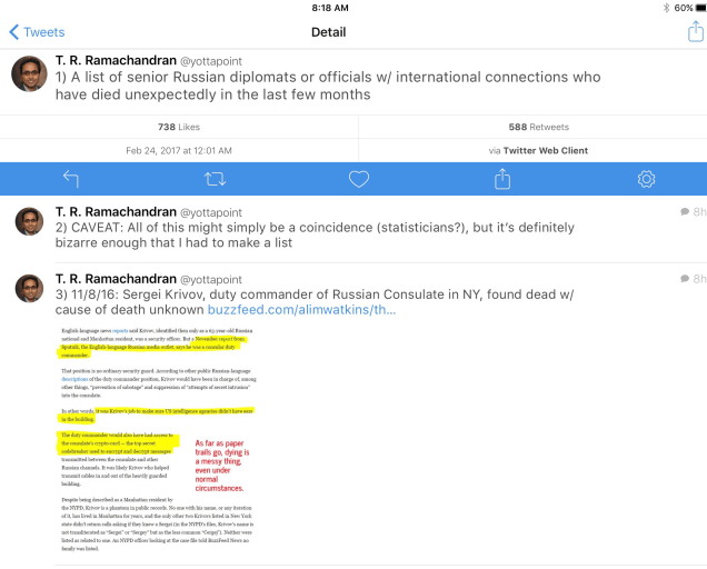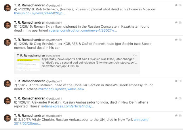 On the Russian side, there have been seven deaths of high profile Russians in last three months. Putin is killing the evidence.