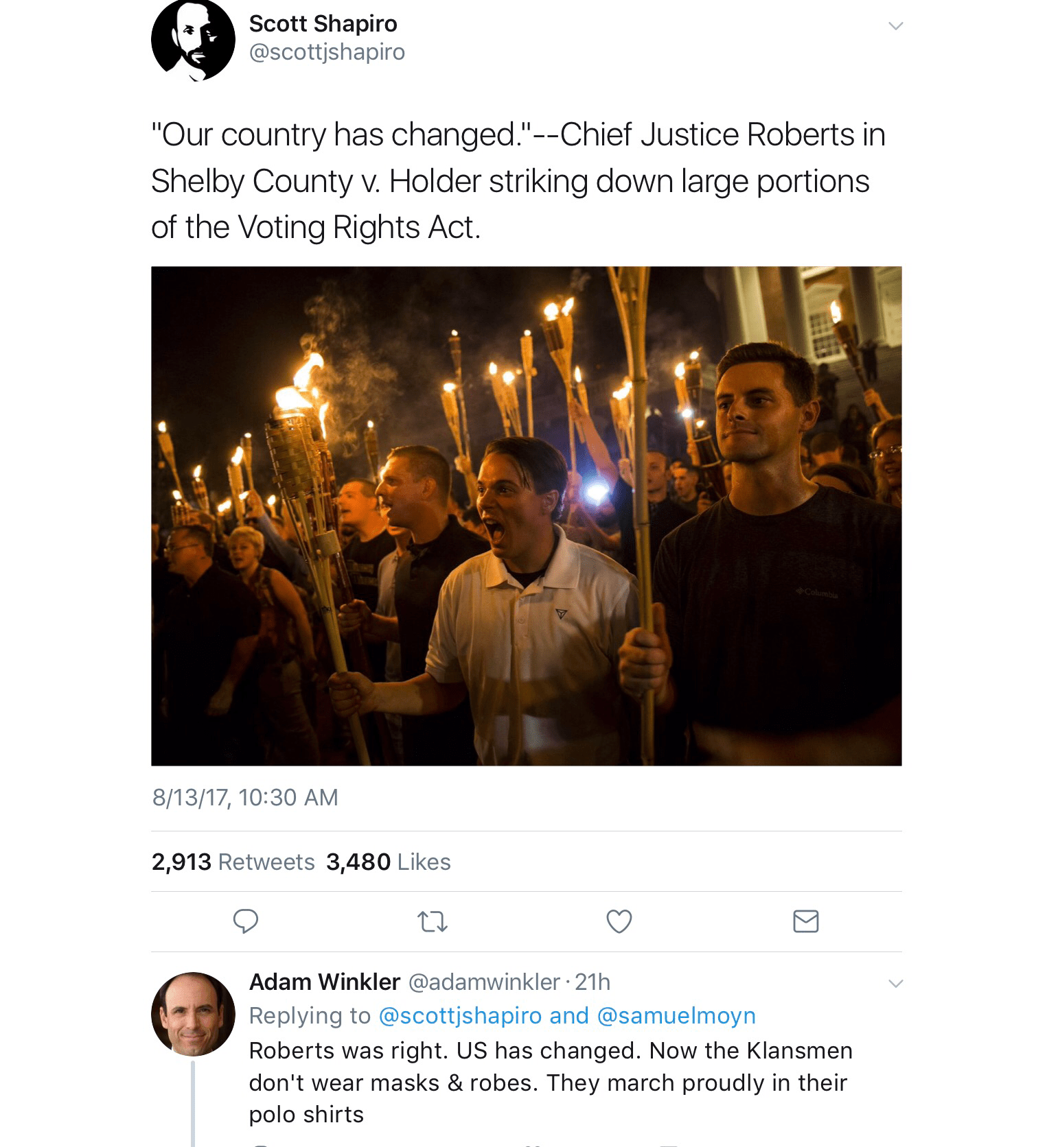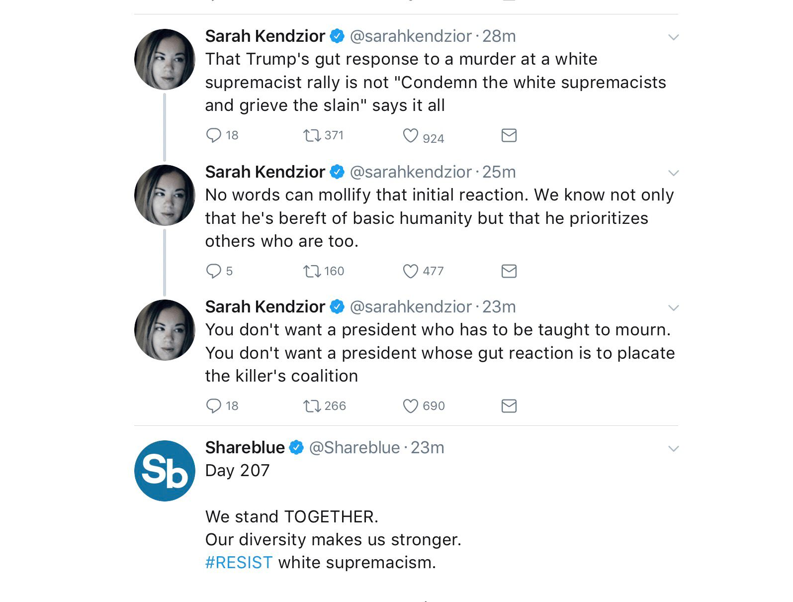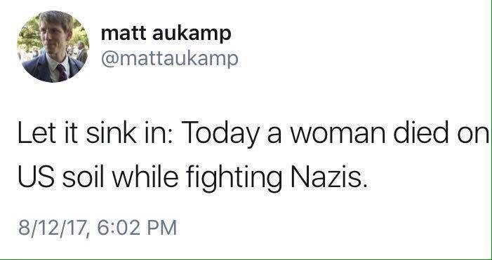 But there are not many sides to Charlottesville. There is the anti-racist activist who was killed, and the white supremacist who killed her. There is the mob chanting the Nazi cry of “blood and soil,” and the citizens demanding equality and respect. There is the confederacy, and there is the United States. There are the torches of neo-Nazis and the torch of the Statue of Liberty. There is Donald Trump and there is patriotism.