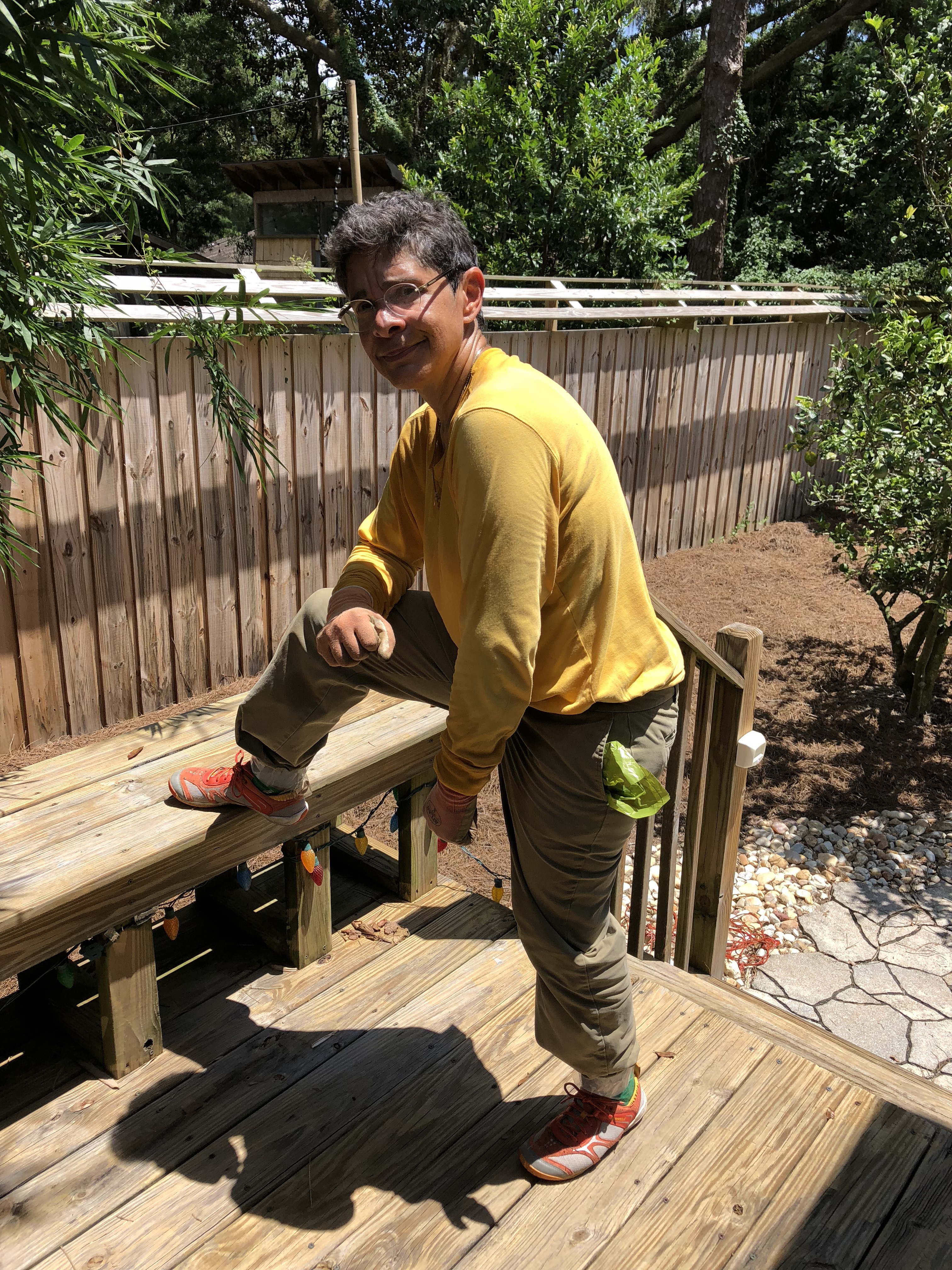 Today M decided to spread the rest. She prepared by covering up – on this 90 plus degree day.