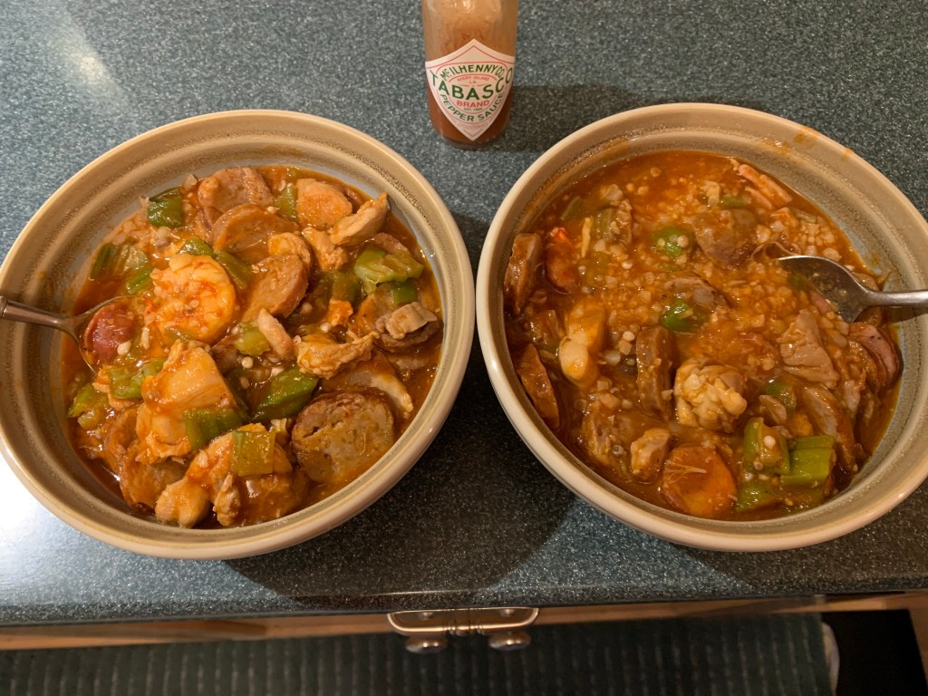 Yesterday we made “Gumbalaya”. Think chicken, sausage, shrimp, okra, celery, onion, green pepper, cajun seasonings…